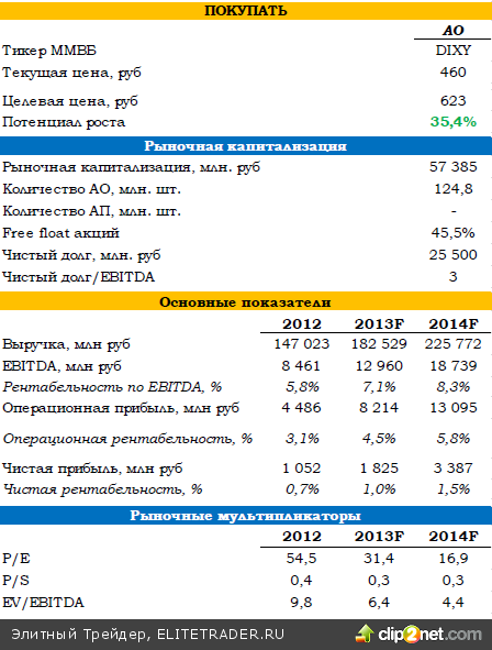 При этом показатели ближе к таковым у Х5, несмотря на то, что идейно компания, на самом деле, ближе к Магниту. Более того, мы ожидаем, что уже в 2013 и в последующих годах при сохранении текущих котировок Дикси окажется даже дешевле Х5 по EV/EBITDA, так как темпы роста EBITDA у Дикси существенно выше.