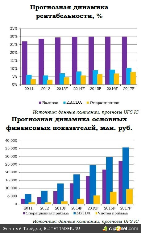 Ожидаем, что по итогам года EBITDA составит порядка 13 млрд рублей ($390-400 млн), в 2014 году рост показателя составит порядка 45%. К 2015 году рентабельность по EBITDA должна быть в диапазоне 8-9%, причем мы ожидаем, что показатель будет ближе к 9%.