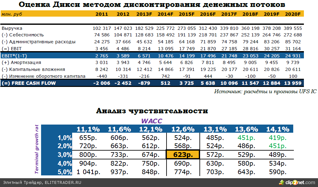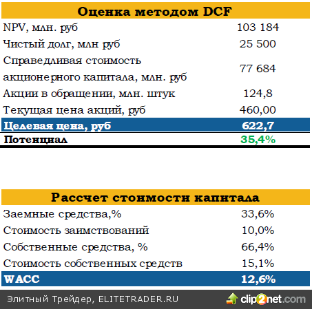 Средневзвешенная стоимость капитала оценена нами на уровне 12,6%, что учитывает высокие риски акционерного капитала, связанные с невысокой ликвидностью, а также высокие процентные расходы компании. Мы считаем эту величину адекватной на текущий момент, однако по мере дальнейшего роста сети и повышения ликвидности бумаг оценка риска может снизиться;