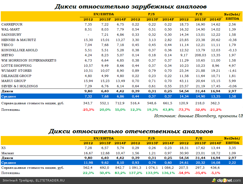 Мы провели сравнительный анализ акций Дикси на фоне группы зарубежных и российских аналогов. При этом мы использовали такие показатели, как EV/EBITDA, P/S и P/E, рассчитанные по результатам 2012 года и на основе прогнозных показателей на 2013-2014гг.