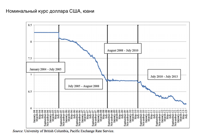 Сам юань привязан к доллару, причем до июля 2005 года эта привязка была достаточно жесткой. Затем ему позволили колебаться к доллару в рамках определенного диапазона. Тогда за три года он подорожал на 17,5%.