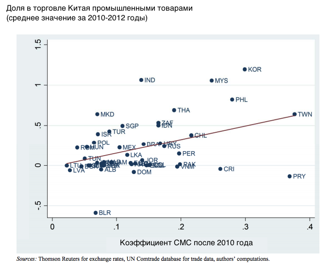 Самое очевидное объяснение - это торговая интеграция. Действительно, развитие торговли с Китаем заставляет валюты следовать за юанем.