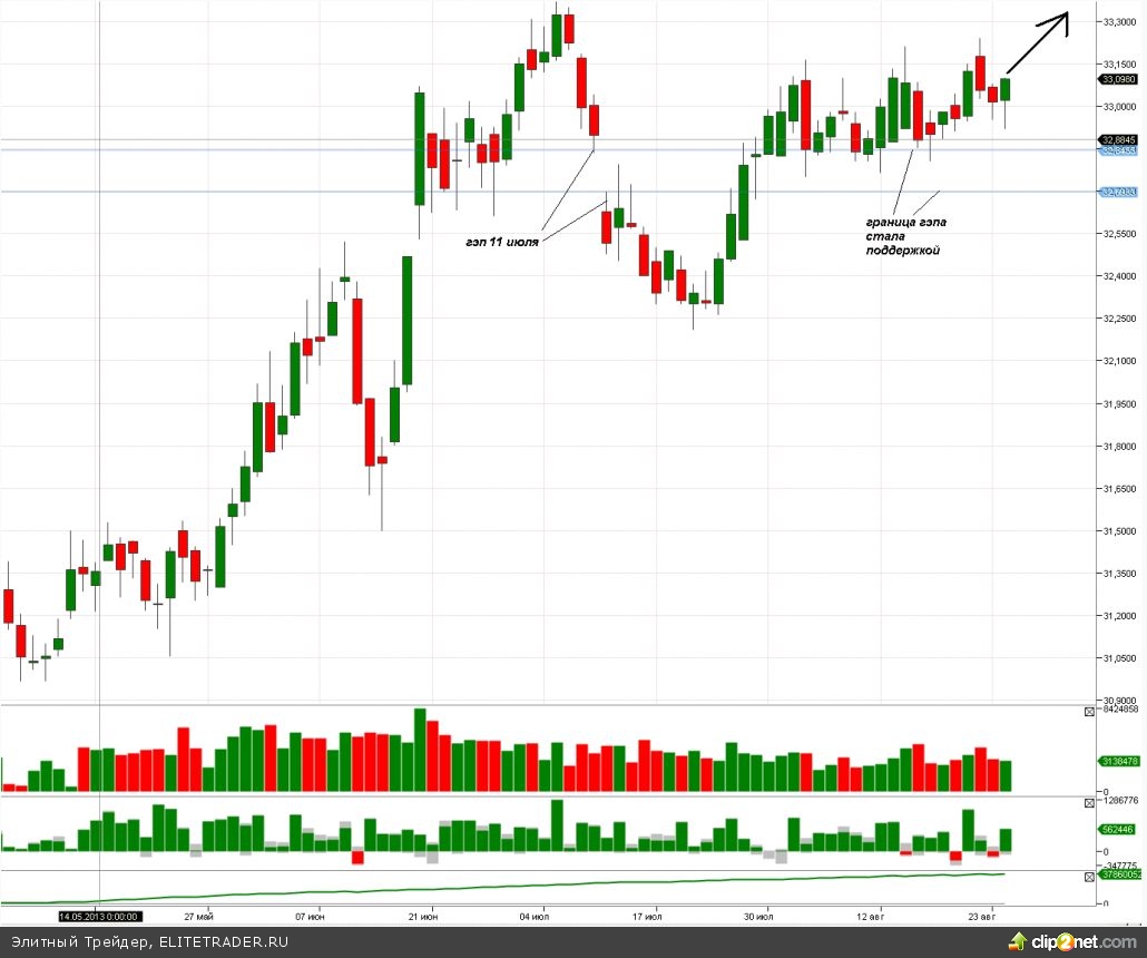 Фьючерс доллар-рубль с 29 июля находится в узком диапазоне 33 000 — 33 350 пунктов. В пятницу вечером уже были признаки спроса на доллар, однако сегодня свозили на стопы в район 33 050 пунктов. Откуда пошли уже более устойчивые и планомерные покупки: