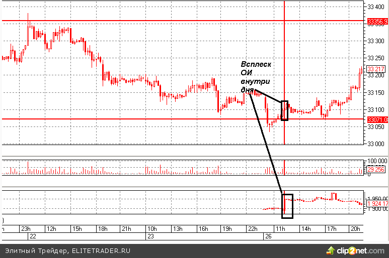 В обед наблюдался всплеск ОИ (в 12-12-15мск). Это подчеркивает о входе в позицию в расчете на трендовое движение.