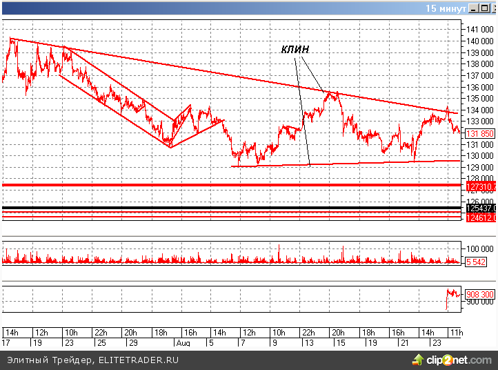 С 29 июля фьючерс на индекс РТС удерживался в диапазоне 130 000 — 135 000 пунктов (по закрытиям дня). Столь грандиозная серия привела к уникальному факту — в этом флэте было 5 дней в августе, когда одновременно обновлялся и максимум и минимум предыдущего дня. Это чрезвычайно уникальный факт для фьючерса на индекс РТС (обычно, не более 2 дней в месяц).