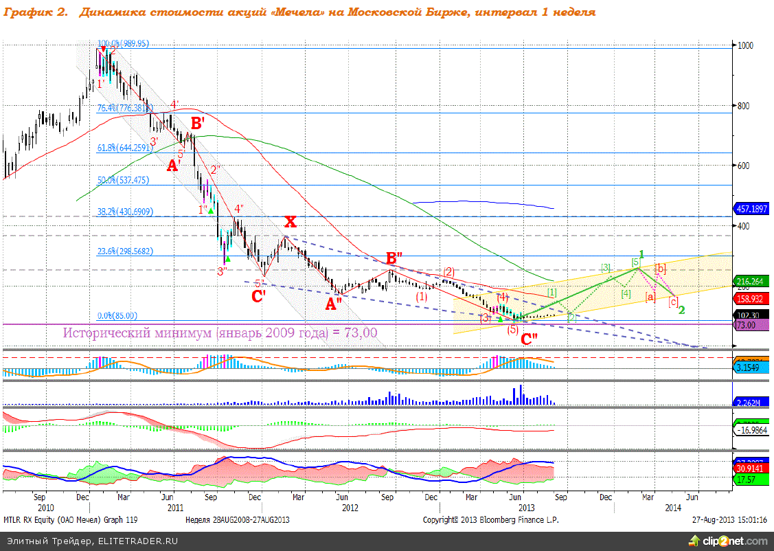 С января 2011 года акции «Мечела» находятся в фазе снижения. За данный период стоимость бумаг компании снизилась на 91,41% с максимальной отметки в 989,95 рубля за акцию до значения 85,0 рублей в начале июня 2013 года.