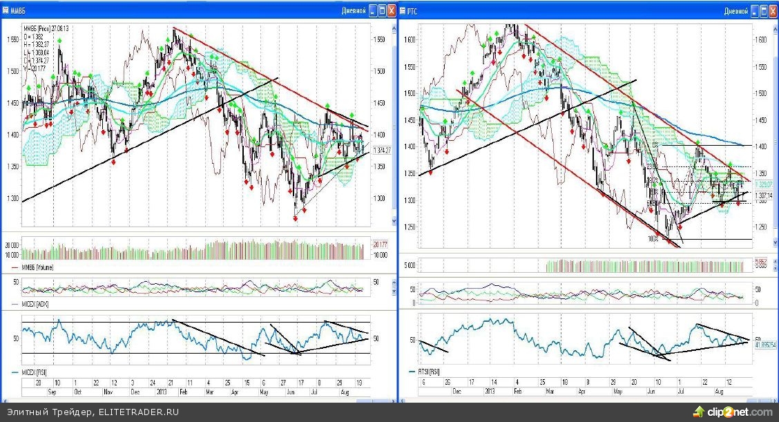 Однако уже вчера индекс ММВБ опускался до отметки 1368,04 пунктов, которая находится в непосредственной близости от уровня поддержки, соединяющего точки 1331; 1353,73 и 1365,28 пунктов соответственно, что повышает шанс пробой именно этого уровня. Но пока ни одного дня не будет уверенно закрыто под крайним дневным фракталом на продажу (у индекса ММВБ это отметка 1365,28 пунктов, а у индекса РТС уровень 1298,77 пунктов), я не стану советовать открывать среднесрочные «шорты». После прохождения этих рубежей игра на понижение станет более актуальной и вероятно цели будут достигнуты довольно быстро, ведь всем известно, что чем длительнее консолидация, тем сильнее выход из неё.