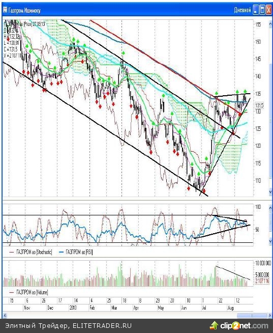 Пока акции газового монополиста продолжают находиться внутри образованного восходящего «клина» и хотя они по итогам вчерашнего дня и потеряли 0,64%, нижняя граница фигуры пока пробита не была.