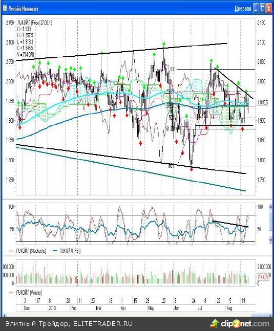 Пока дневной график бумаг «Лукойла» продолжает напоминать мне фигуры «треугольник», где верхняя граница проведена через дневные фракталы на покупку, расположенные на уровнях 2029,8; 1988,1 и 1968,2 рублей соответственно, а в качестве нижней можно выбрать линию, соединяющую отметки 1886 и 1883,5 рублей.