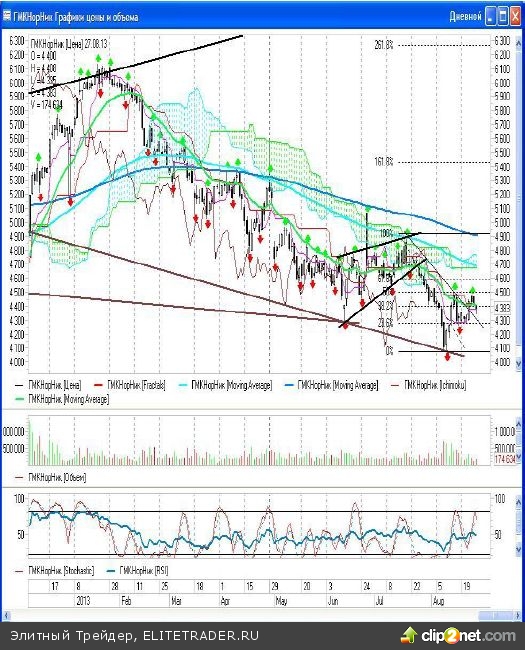 Бумаги ГМК «Норильский Никель», судя по их дневному графику, пытаются дать пересечение на «лонг» по индикатору Ишимоку, и пока удерживают район 4400 рублей.
