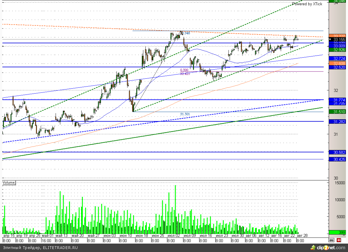 Рубль прибавляет символические 5 копеек по отношению к доллару. Российская валюта снова торгуется у своих минимальных значений, и буквально на грани от пробития ключевой поддержки на уровне 33,3. Пробой данной отметки может значительно ускорить ослабление рубля. Впрочем, в текущий момент драйверов для этого слишком мало, и высокие цены на нефть вместе с интервенциями ЦБ вполне могут вернуть рубль в район 32,8. В свою очередь возможность сокращения стимулирующих программ в США в среднесрочной перспективе продолжит оказывать негативное влияние на валюты развивающихся стран. Поэтому сейчас покупать рубль можно только с краткосрочными спекулятивными целями, при этом фиксируя даже минимальную прибыль, а риски ограничивая с предельной жесткостью.