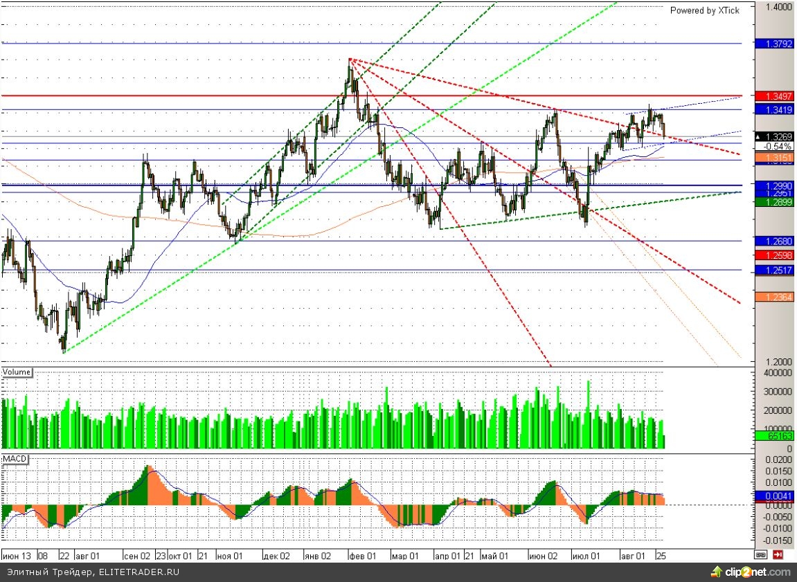 Евро теряет к доллару более 0,5%. Столь стремительное укрепление доллара по отношению к евро связано со снижением опасений относительно ситуации с Сирией. Еще накануне Барак Обама заявил, что пока не определился с дальнейшими действиями по данному вопросу, чем и спровоцировал укрепление американской валюты. В свою очередь поддержку европейской валюте сегодня снова оказывает статистика по еврозоне. Индекс деловой активности в розничном секторе региона в августе добрался до 50,3. При этом евро вновь подобрался к краткосрочной трендовой линии вблизи уровня 1,325. Пробой данной отметки может спровоцировать ускорение снижения с первой целью в виде уровня 1,31.В обратном случае мы увидим очередную импульсную волну вверх с целями не менее 1,35.