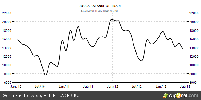 Пару слов про торговый баланс России. Он в последнее время явно хромает. Динамика профицита торгового баланса повторяет динамику индекса РТС (профицит в первой половине 2013 года ниже профицита в 2012 году):