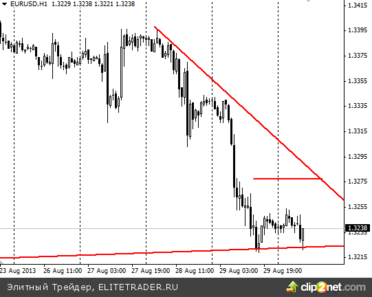 Рубль теряет к доллару 3 копейки. Российская валюта продолжает торговаться у своих минимальных значений и может в любой момент выйти из диапазона, в котором она находится вот уже более месяца. В краткосрочном плане здесь очень многое будет зависеть от дальнейших действий западных стран по отношению к Сирии. В случае начала военной операции доллар может упасть к рублю в район 32,9, при этом дополнительным негативом для «американца» в ближайшем будущем станет вопрос с потолком госдолга США. В свою очередь не стоит забывать и про риск сокращения стимулирующих программ на ближайшем заседании ФРС. Данный момент, вероятно, продолжит играть на стороне американской валюты. Таким образом, ситуация в текущий момент немного противоречивая и очень сильно зависит от новостного потока. Поэтому для того, чтобы предпринимать активные действия желательно дождаться определенности в ситуации с Сирией.