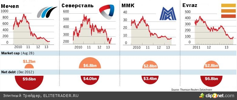 Русал, крупнейший в мире производитель алюминия, борется с чистым долгом в размере $9,9 млрд (на конец 2 кв.). Этот долг почти в 12 раз больше показателя EBITDA. До конца года компании нужно выплатить $400 млн процентов по кредитам. Долг угледобывающей компании Мечел на данный момент составляет более $9 млрд. Это сумма в 7 раз больше его рыночной капитализации и более чем в 10 раз превышает прогнозируемую по итогам 2013 года EBITDA, по данным ВТБ Капитал. В чуть менее сложном положении находится торгующийся в Лондоне Evraz. Но компания уже потеряла свое место в индексе FTSE 100 из-за существенного падения капитализации.