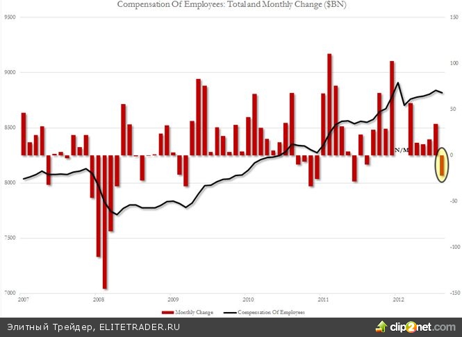 Тем временем, если посмотреть на такой компонент доходов американцев как месячное изменение размера зарплат у трудоспособного населения, то можно увидеть, что показатель упал на $21.9 млрд – самое крупное снижение с мая 2012 года. Довольно странный момент на фоне восстановления экономики США.