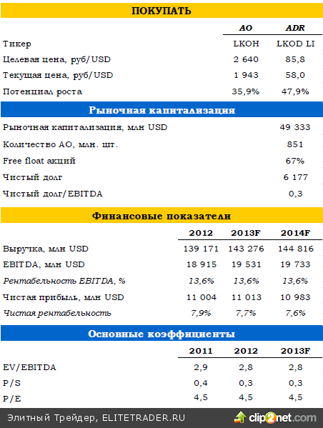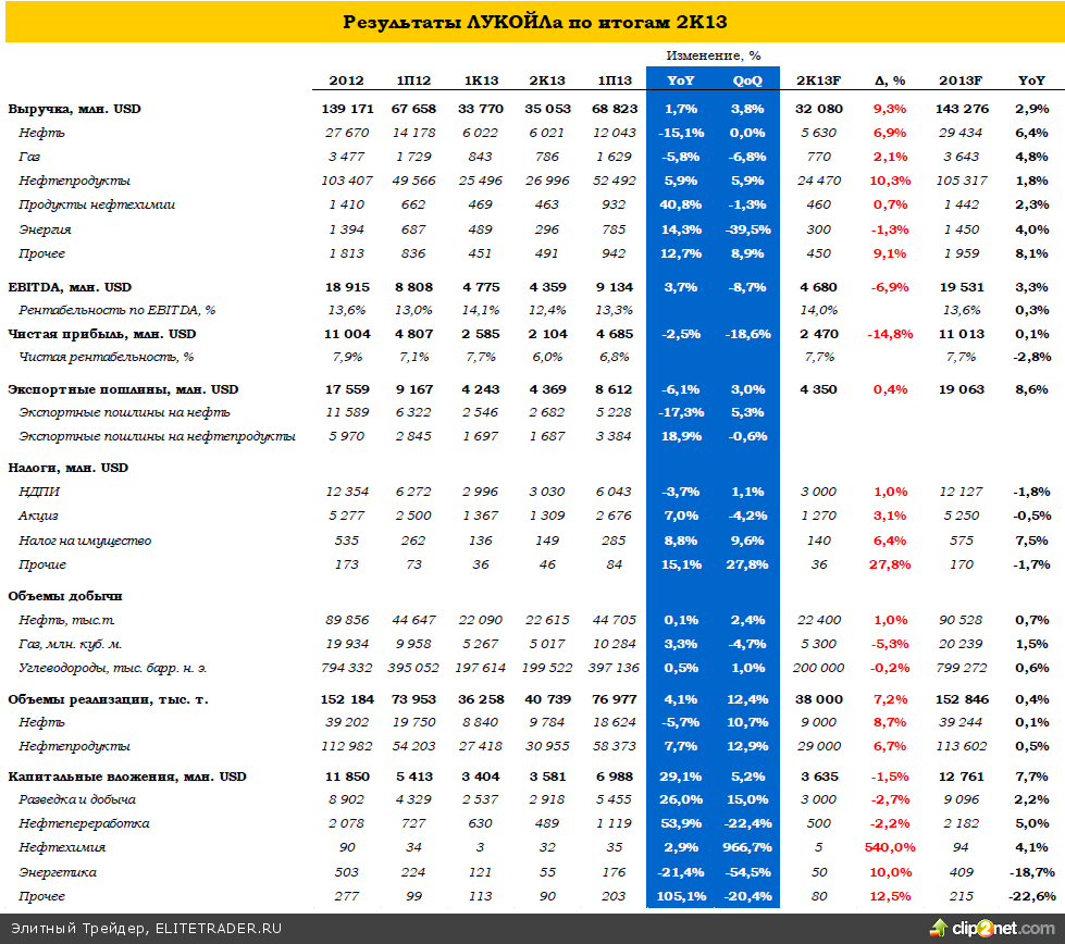 В результате столь активного наращивания поставок нефти и нефтепродуктов в 2К13 ЛУКОЙЛ сумел существенно опередить наш прогноз по выручке. В то же время, операционная эффективность закономерно пострадала, и на фоне снижения цен на нефть компания даже при более высоком уровне выручки не смогла достигнуть прогнозного уровня по EBITDA и чистой прибыли. Впрочем, по эффективности бизнеса ЛУКОЙЛ по-прежнему является одним из лидеров на рынке.