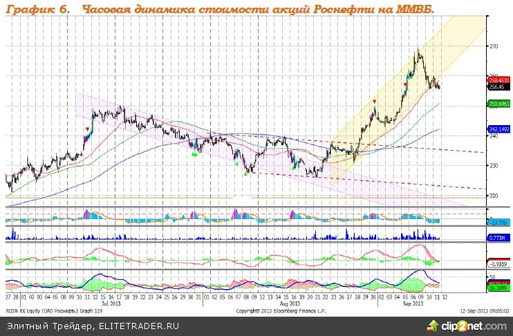 Роснефть – вышла за пределы восходящего тренда, ждем отскока для закрытия длинной позиции. MACD сформировал сигнал вниз. ADX указывает на прекращение локального восходящего тренда. Индикатор, основанный на динамике ADX, 5 сентября сформировал сигнал к снижению. Поддержка – 250,00. Сопротивление – 265,00. Рекомендация: Держать