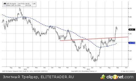 Газпром, как мы и предполагали, отработал разворотную модель и вполне может скорректироваться к 135 рублям, где, на наш взгляд, расположена сильная линия сопротивления. Этот уровень цен, можно использовать как повторную попытку войти в «длинные» позиции.