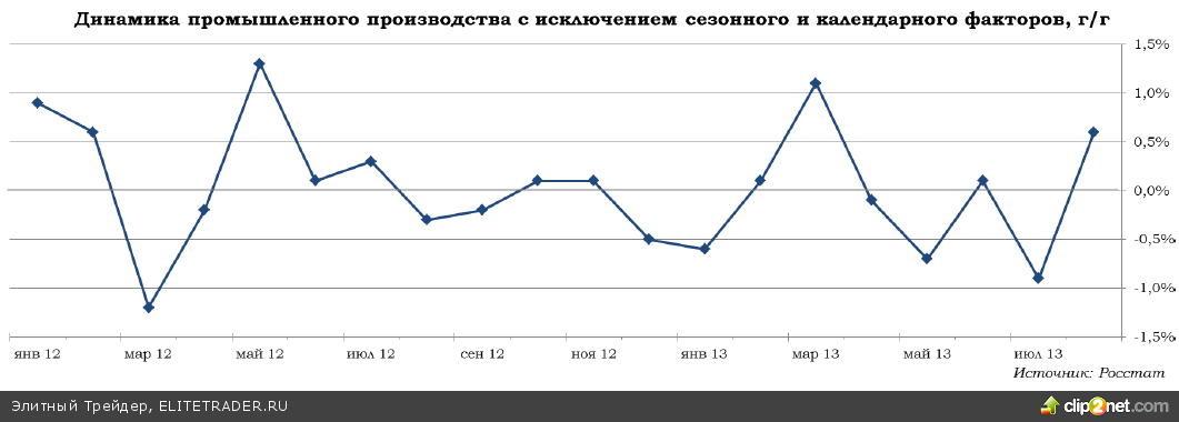 Накануне Росстат представил свежие данные по объему промышленного производства. В годовом выражении объем промпроизводства в августе увеличился на 0,1%, что оказалось выше консенсус-прогноза Bloomberg 0,0%. В месячном сопоставлении рост составил 0,6%, после исключения сезонного и календарного факторов — 0,7% (в этом году в августе рабочих дней было на один меньше).