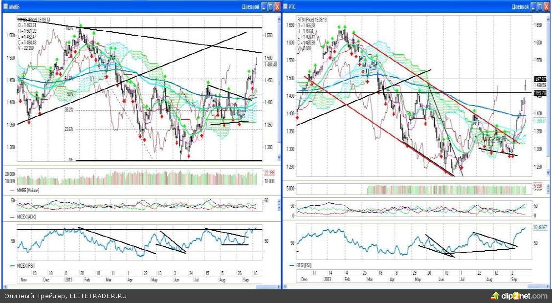 Первая радостная реакция игроков на факт оставления прежних объемов QE3, очевидно, уже прошла. И если в течение вчерашних торгов оба индекса ММВБ и РТС показывали приросты, равные , то к закрытию основных торгов от дневного роста осталось лишь 1,52% и 3,44% соответственно. Конечно, неплохо, но вот дневная свеча на графике ММВБ явно не сулит ничего хорошего. Рынок выглядит перегретым уже давно и вполне возможно именно суперпозитивная новость и была нужна для того, чтобы заманить в «длинные» позиции неопытных игроков. Я же с текущих рубежей не вижу предпосылок к дальнейшему подъему, по крайней мере, без коррекции, хотя не исключено, что локально индекс ММВБ может еще подняться до 1520 пунктов. Вчера же его подъем был ограничен отметкой 1501,32 пунктов. Для себя зону 1500-1520 пунктов по индексу ММВБ я определила как ключевую, ведь если соединить максимум марта 2012 года и января 2013 года, то примерно на эту зону попадает долгосрочная линия сопротивления падающего тренда. Пока она не пробита, логично предположить, что от неё индекс может отразиться и нарисовать разворот. В случае же взятия этого уровня и закрытия недельного (а лучше всего и месячного) интервала времени, чисто с технической точки зрения у российского рынка акций появится потенциал к росту, порядка 25-30%. При этом сразу стоит оговориться, что это и временной горизонт достижения нужных целей может занять от полугода и более. Но пока я предпочитаю не поддаваться эйфории и не пытаюсь заглянуть за горизонт, закрыв ранее многие «лонги», сейчас я предпочтение отдаю тому, чтобы оставаться в «КЭШе», ведь деньги на бирже – это самый ценный ресурс. И не стоит их занимать теми позициями, в которых нет уверенности.