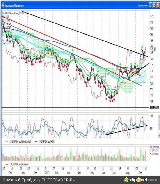 ГАЗПРОМ Несмотря на разогретый внешний фон вчера к утру, бумаги «Газпрома» хотя и выстреливали до уровня 149,7 рублей, к концу дня заметно отошли от своих максимальных уровней. Рост по итогам четверга составил 2,8%, при этом на уровне 144,3-147,35 рублей остался заметный разрыв. В прошлом своём обзоре я писала о том, что появление нового максимума выше отметки 148,7 рублей, при образовании дивергенций на осцилляторе, может быть сигналом к формированию вершины, и даже образованию фигуры разворота. В связи с этим могу высказать два своих предположения. Первое актуально для желающих рискнуть прямо сейчас. Им предлагается открытие «коротких» позиций со «стопом», выставленным за уровнем 150 рублей и целью закрытие вчерашнего разрыва. Второе станет актуальным при образовании «двойной вершины» и пробития уровня 142,1 рублей, уже с более глубокими целями коррекции, такими как зона 134,5-136 рублей.