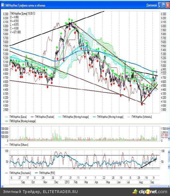 ГМК НорНикель Также меня не совсем радует вчерашняя свеча, образованная на дневном графике акций ГМК «Норильский Никель», ведь хоть формально она и выше отметки 4778 рублей, но она также выглядит как «падающая звезда», при условии, что ценам не удалось даже закрепиться выше уровня скользящей средней ЕМА200 на днях. Эта информация для тех игроков, кто рассчитывает увидеть дальнейший рост цен в этой бумаге. Будьте внимательны, пока такие интервалы времени как дневной не закрыт выше ЕМА200, а недельный выше ЕМА21, исключать ложного выхода наверх нельзя. В связи с этим, если вы уже открыли «длинные» позиции в этих акциях, следите за тем, чтобы цены не возвращались в пределы фигуры. Тем, кто не успел присоединиться к росту – ждать закрепления выше уровней ЕМА200 по дням и ЕМА21 по неделям