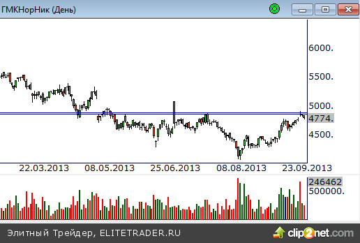 У горизонтального уровня предложения, расположенного в районе отметок 4900-4850 рублей, весь покупательский спрос был полностью удовлетворен. Объемы прошли соответствующие. После чего новых покупателей не нашлось. Цены начали отбиваться от уровня вниз, а объем торгов упал в разы. Таким образом, есть основания ожидать дальнейшего движения цен вниз.