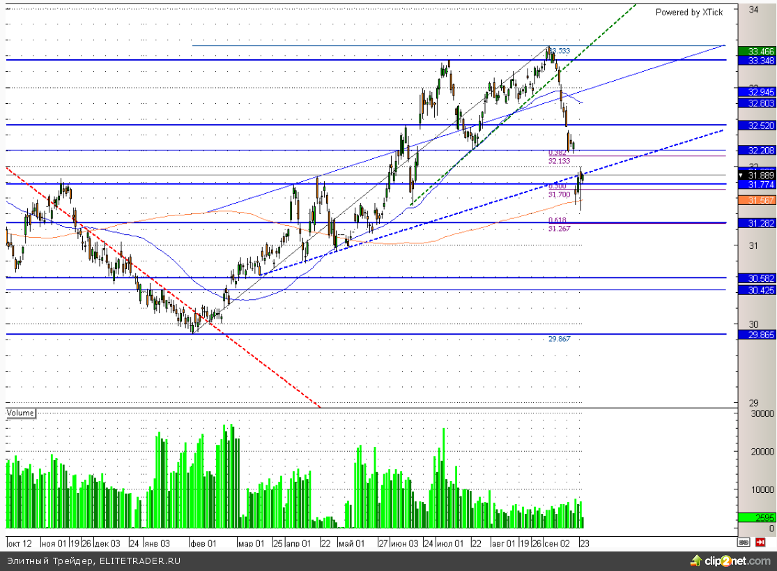 Между тем пара доллар/рубль продолжает консолидироваться под восходящей трендовой линией. Закрепление выше нее и соответственно отметки 32 может существенно укрепить позиции доллара, но пока мы находимся под трендом, рубль имеет больше шансов на рост.