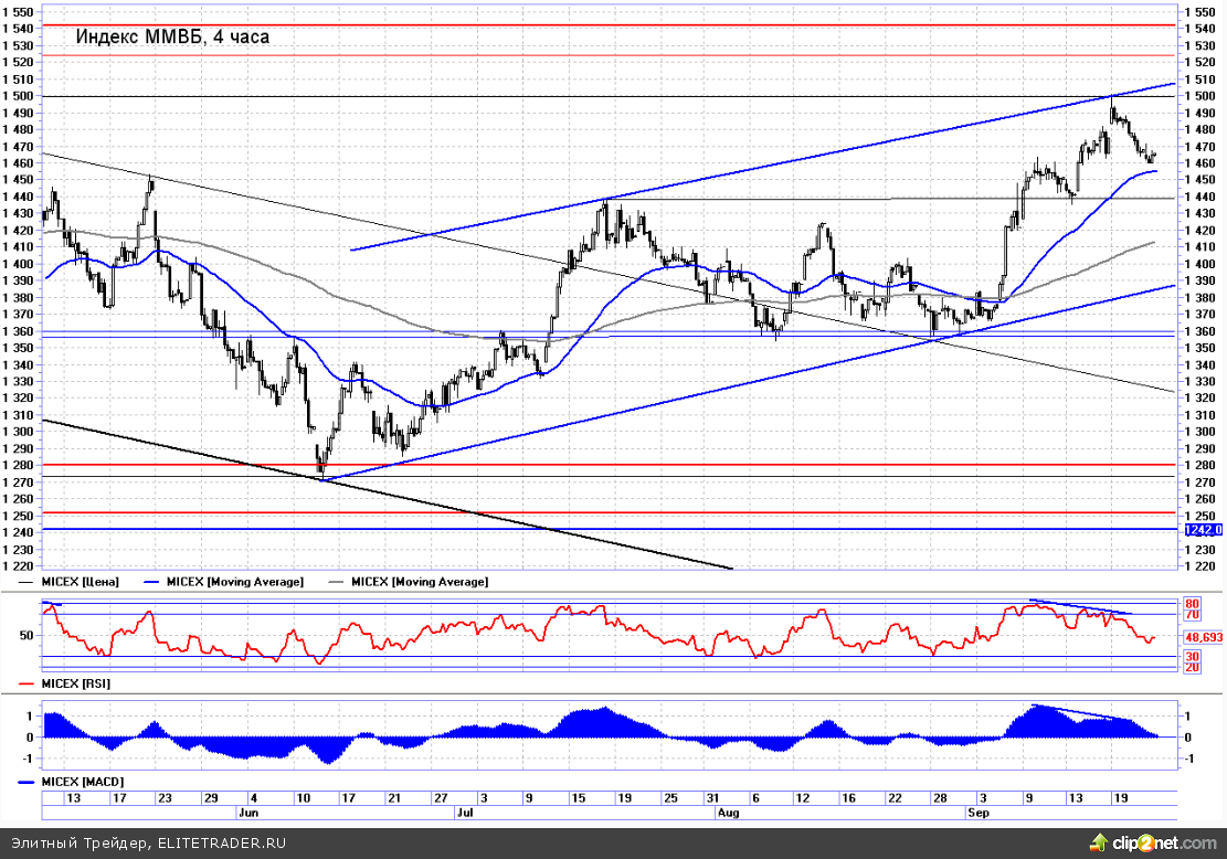 Индекс ММВБ продолжает постепенно скатываться вниз, но за последний день изменения были минимальны, проторговываются уровни в диапазоне 1460-1470 пунктов. Сейчас индекс находится вблизи своего 23,6%-ного уровня коррекции по Фибоначчи последней волны роста с конца августа.