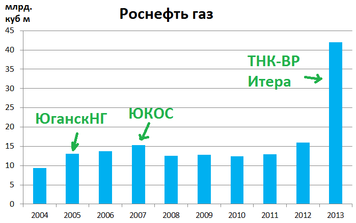 Вопреки слухам о том, что Роснефть покупает ЛУКОЙЛ или Башнефть мы по факту видим совершенное иные объекты которые выбирает Роснефть для покупок. Вполне осмысленная газовая стратегия и превращение из нефтяной в нефтегазовую компанию. Планы по добыче - 100 млрд. куб. м. к 2020. Это будет второй НоваТЭК. в 2013 планы добыть 42 млрд. куб.м.