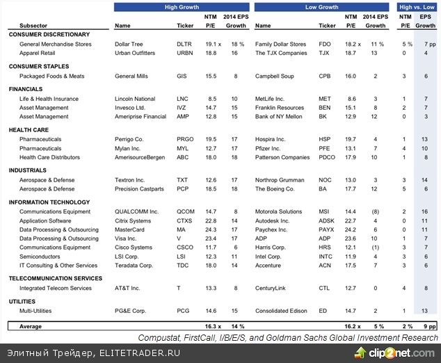 Другими словами, по словам Костина, акции с разными прогнозами роста теперь оцениваются по одинаковым коэффициентам. «Дело в том, что спрос инвесторов был очень глубоким, поэтому акции с низкой стоимостью обогнали бумаги с высокой стоимостью в 2013 году», - объясняет Костин. Так же, по его мнению, обстоят дела в различных секторах: 9 из 10 сегментов индекса S&P 500 имеют разброс P/E ниже 30-летних средних значений, исключением стал лишь финансовый сектор. BusinessInsider