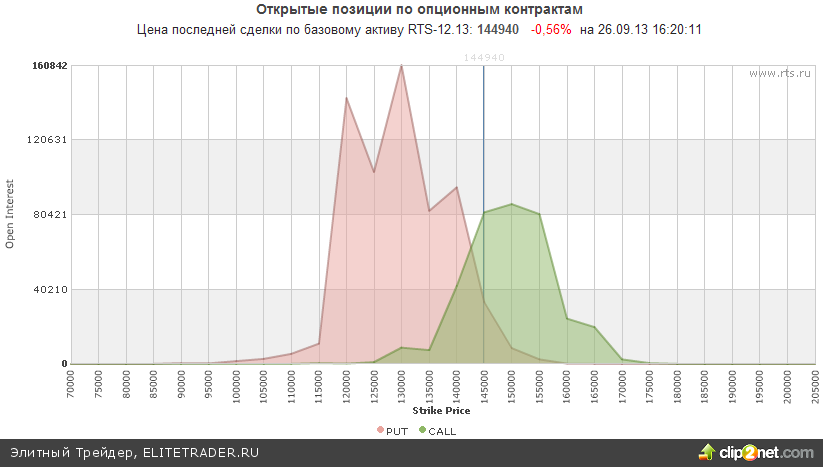 Между тем открытые опционные позиции по RIZ3со сроком исполнения 15.10.13 сейчас дают умеренный сигнал на продажу. На отметке 145000 можно увидеть огромное количество опционов колл, которые выступают очень сильным сопротивлением. При этом максимальное количество опционов колл расположилось лишь вблизи уровня 140000.