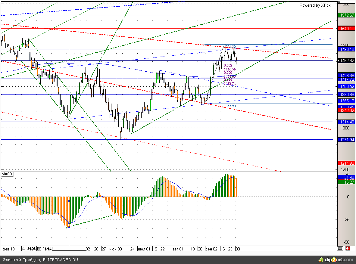 Российский рынок завершил торговую сессию понедельника на отрицательной территории. При этом индекс ММВБ сегодня практически добрался до уровня 1450, где находится 38,2% коррекции по Фибоначчи к волне роста, и вполне возможно уже в самом скором времени мы увидим попытки отскочить от данной отметки.