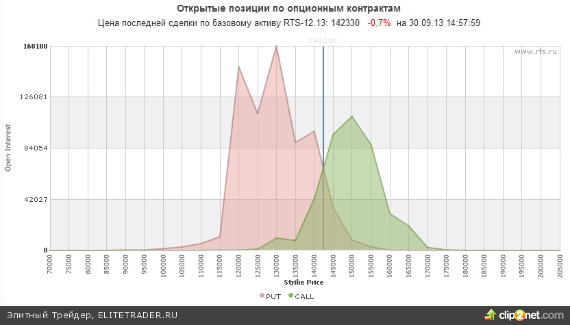 Между тем открытые опционные позиции по RIZ3 со сроком исполнения 15.10.13 сейчас смотрятся нейтрально. Большое количество открытых опционов колл открыто на отметке 145000 что говорит о сильном сопротивлении на данном уровне, а на отметке 135000 находится примерно эквивалентное количество опционов пут , что при текущей цене, равной 142000 не дает ровным счетом никаких сигналов.