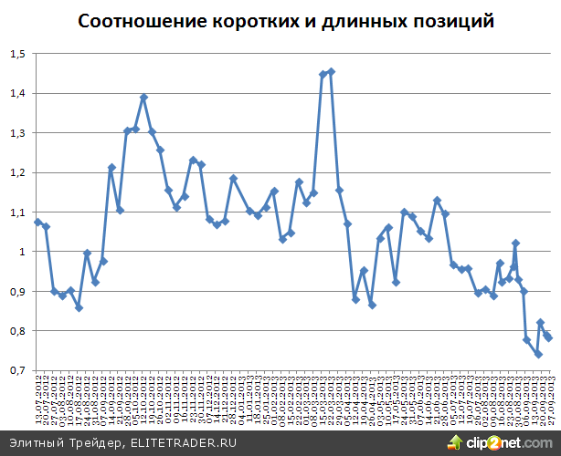 Обратив внимание на открытые юридическими лицами позиции по RIU3, можно заметить, что настроения крупных игроков за прошедшие 2 дня еще более углубились в сторону покупок. Соотношение коротких и длинных позиций на 27 сентября составило 0,785, тогда как 25-го было 0,791.