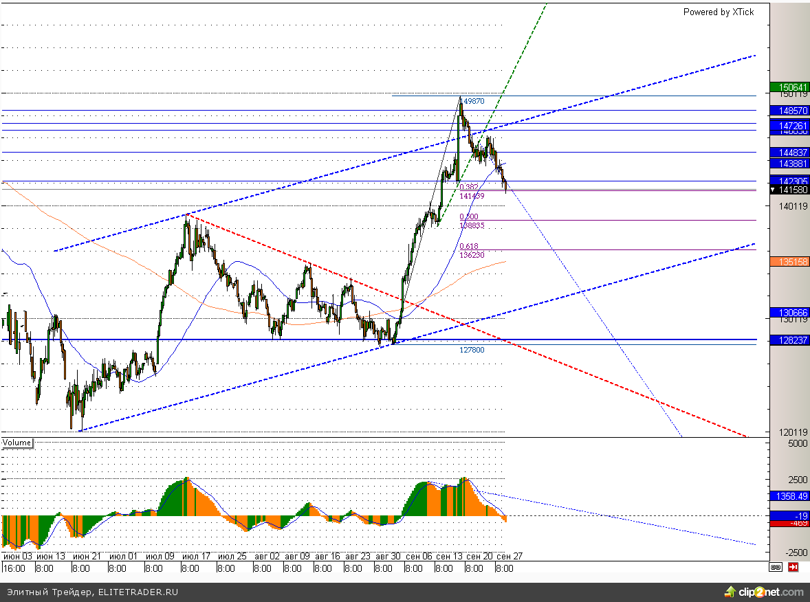 RIZ3 сегодня демонстрирует снижение, теряя чуть более 1%. Данная динамика связана с отсутствием прогресса в согласовании бюджета США, а также с негативной макроэкономической статистикой по Китаю, где индекс деловой активности в производственной сфере за сентябрь составил всего 50,2 пункта. Между тем фьючерс на индекс РТС сегодня подобрался к уровню 141500, где располагается 38,2% коррекции по Фибоначчи к волне роста и вполне может краткосрочно укрепиться от данной отметки.