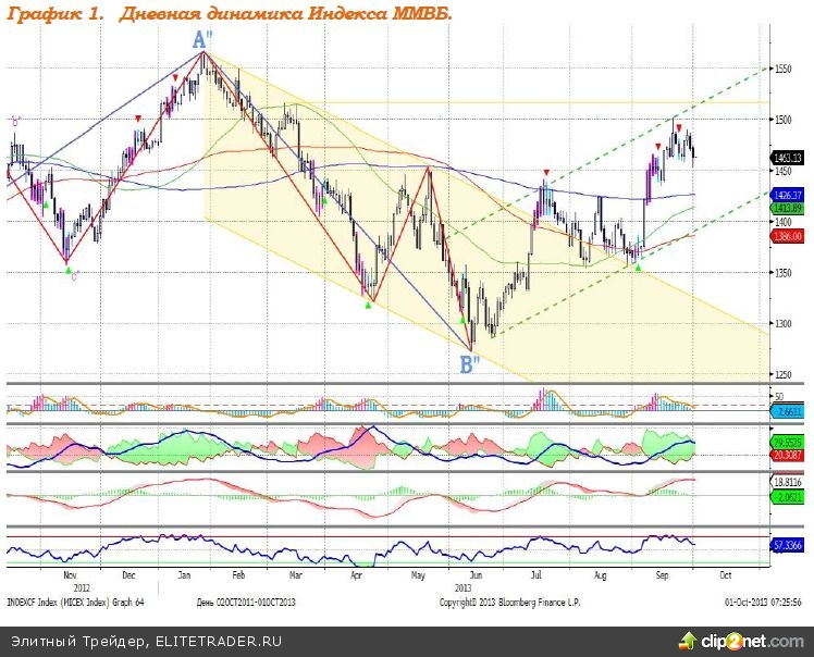 Индекс ММВБ – формирует восходящий тренд. MACD находится в процессе формирования сигнала вниз. ADX указывает на замедление восходящего тренда, DMI+ выше DMI-, ADX в верхней части шкалы и развернулся вниз. Индикатор, основанный на динамике ADX, 12 и 23 сентября дал сигналы к снижению