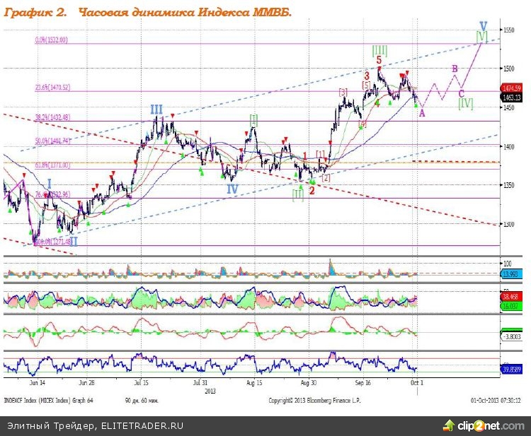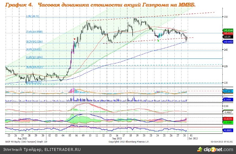 Индекс ММВБ – попытка коррекции в рамках восходящего тренда. MACD сформировал сигнал вверх. DMI+ находится ниже DMI-, ADX в средней части шкалы и направлен чуть вверх, что говорит об наличии нисходящего локального тренда. Индикатор, основанный на динамике ADX, 25, 26 и 27 сентября сформировал сигналы к снижению. Рекомендация: Вне рынка.