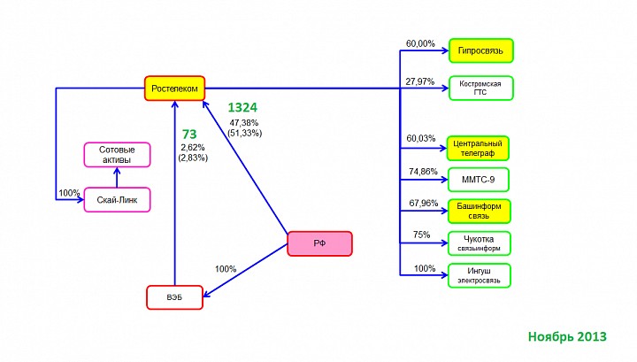 Текущая картинка, до этого был довольно долгий предварительный этап передачи госактивов в Связьинвест и скупки акций Мобителом у Керимова и т.д. Акции указаны с долей в уставном капитале и в скобочках голоса. Также я указал количество голосующих акций Ростелекома в миллионах.