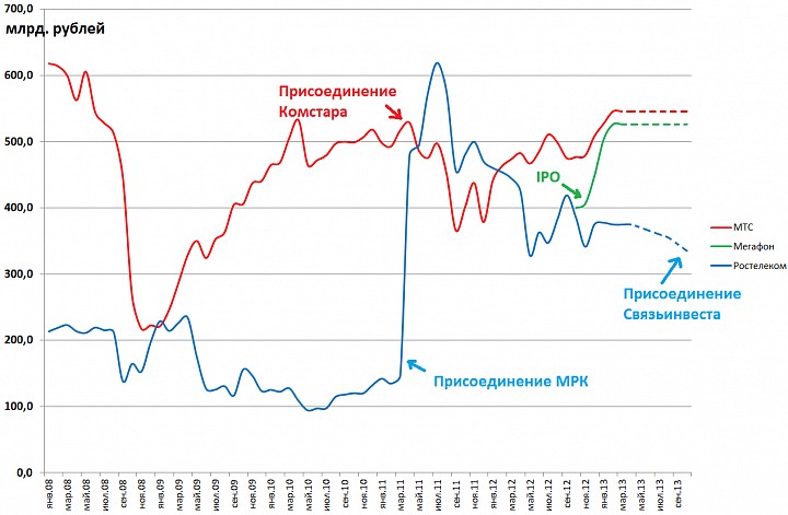 Итак, я посчитал или просчитал возможный ход действий и понял, что инвестконсультанты Ростелекома исходили из задачи получить 50%+1 акция в компании. Получить контроль должно государство. Т.е. они действовали исходя из этого, и для этого была придумана схема со Скай-Линком и Мобителом, а также интересная цифра в 0,345% акций Ростелекома которые докупил Связьинвест на деньги Ростелекома.