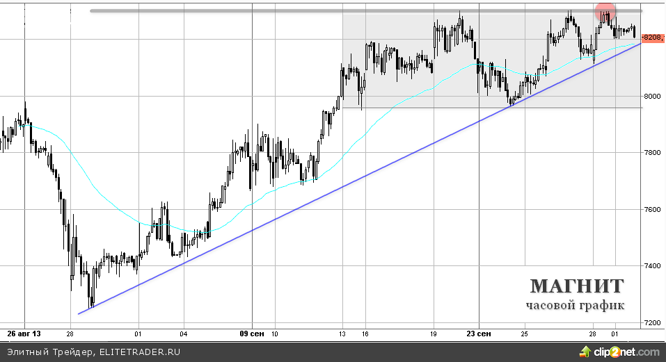 Что стоит за ожесточенным сопротивлением уровня 8300 рублей – активный крупный продавец, или страх покупателей – не столь важно сейчас. Главное, что стало очевидно в последние несколько дней, то, что при все еще «живом» локальном тренде и общем бычьем настрое, на графике Магнита существуют уровни, которые не ломаются при первом же тесте.