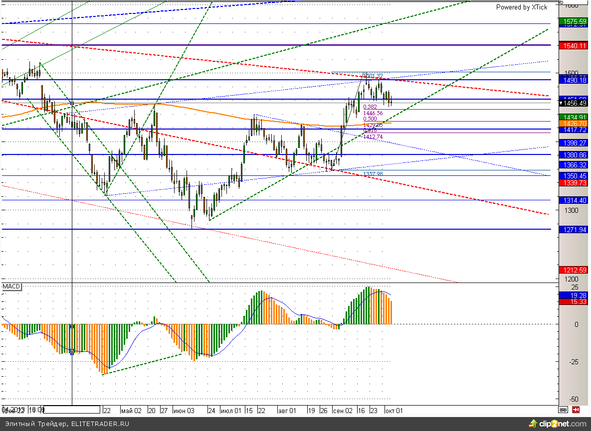Российский рынок завершил торговую сессию четверга около уровней закрытия среды. Индекс ММВБ прибавил символические 0,15% и продолжает плавно спускаться к уровню 1440, вблизи которого проходит трендовая линия и находится 38,2% коррекции по Фибоначчи к волне роста. От данной отметки можно будет пробовать возобновлять покупки, но в текущий момент торопиться не стоит.