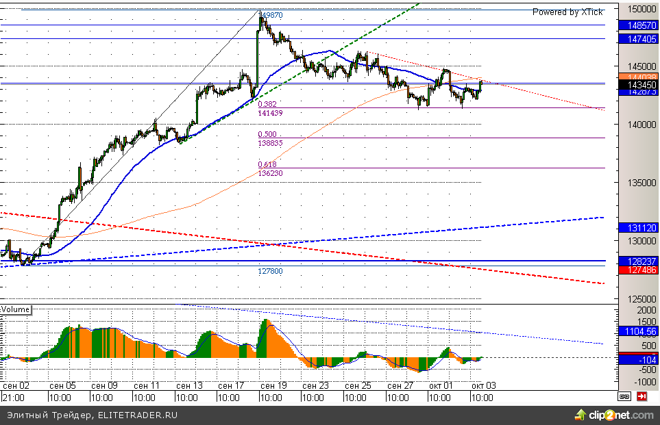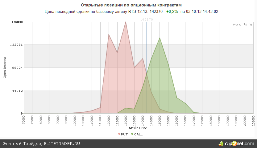 Между тем открытые опционные позиции по RIZ3 со сроком исполнения 15.10.13 сейчас находятся в нейтральном положении и не дают ровным счетом никаких сигналов. Максимальное количество открытых опционов колл расположилось на уровне 150000, что говорит о сильном сопротивлении на этой отметке. При этом максимальное количество открытых позиций по опционам пут находится в районе 130000.