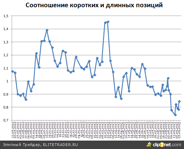 Обратив внимание на открытые юридическими лицами позиции по фьючерсу на индекс, можно заметить, что настроения крупных игроков за прошедшие несколько дней сменились немного в сторону продаж, но по-прежнему настроены на покупки. Соотношение коротких и длинных позиций на 2 октября составляет 0,84 против 0,78 в прошедшую пятницу.
