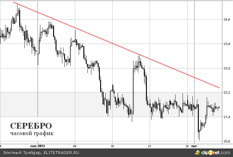 Техническая картина на графике золота не меняется вот уже несколько недель, идет умеренное снижение вдоль локальной линии тренда. В свою очередь, на графике серебра мы можем наблюдать подобную картину. После падения к важному уровню поддержки $20.5 за унцию, цены снова вернулись в «комфортный» диапазон $21.4-22.2 за унцию. Выход из указанного боковика наверх совпадет с пробитием линии тренда и станет сильным сигналом к развороту тенденции.
