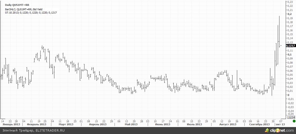 Вся эта ситуация непосредственно на рынке американского госдолга в части его долгосрочного спектра судя по динамике доходностей не сказывается никак. Зато доходность краткосрочных одномесячных векселей резко поднялась на минувшей неделе.
