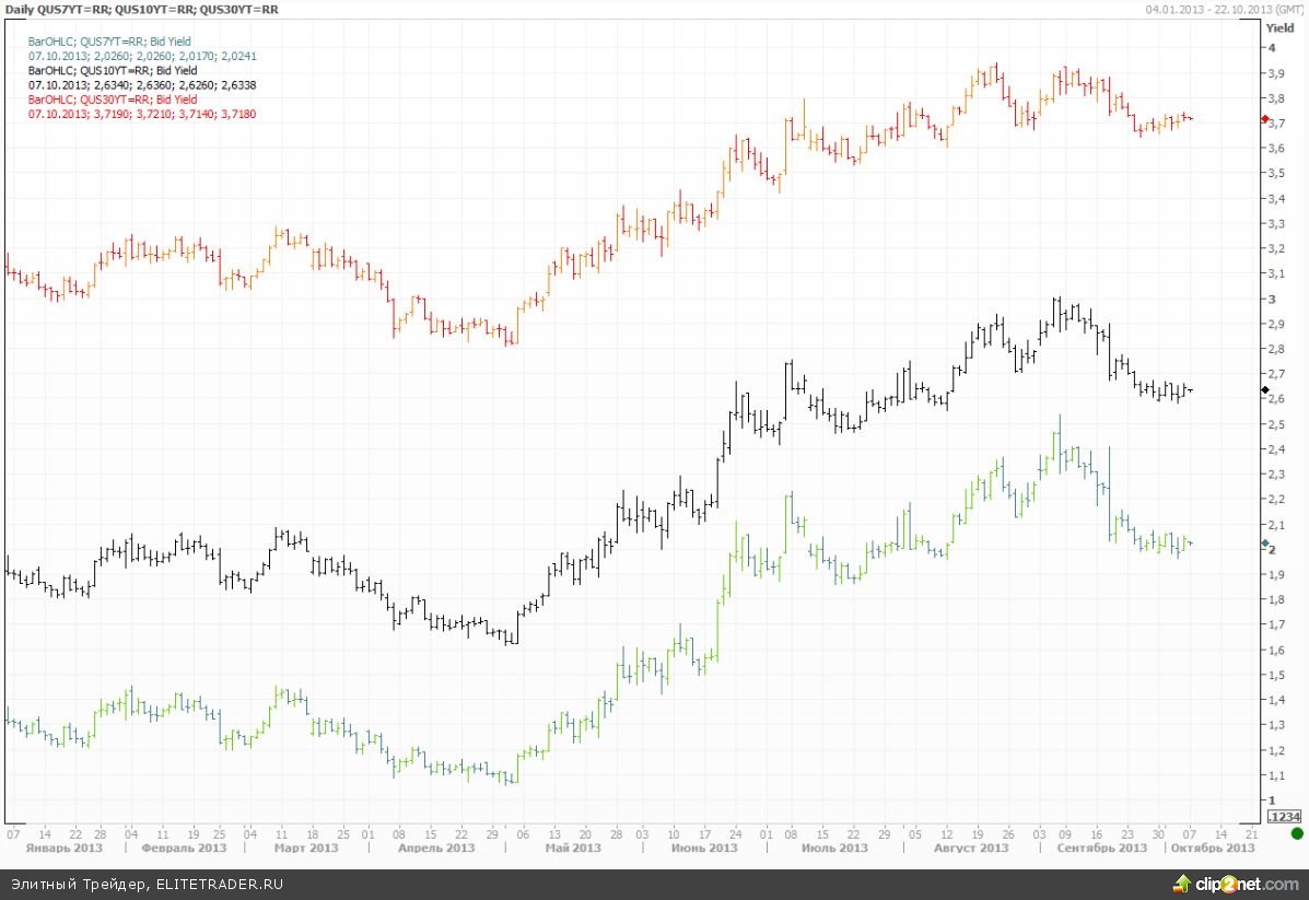 В свою очередь Обама в субботу в еженедельном обращении к нации подчеркнул, что не намерен платить выкуп взамен на открытие правительства и взамен на повышение госдолга. Таким образом, ситуация здесь остается сложная, хотя очевидно обе стороны понимают тяжесть последствий возможного дефолта после 17 октября, той даты на которую в сентябре указывал министр финансов Джек Лью.