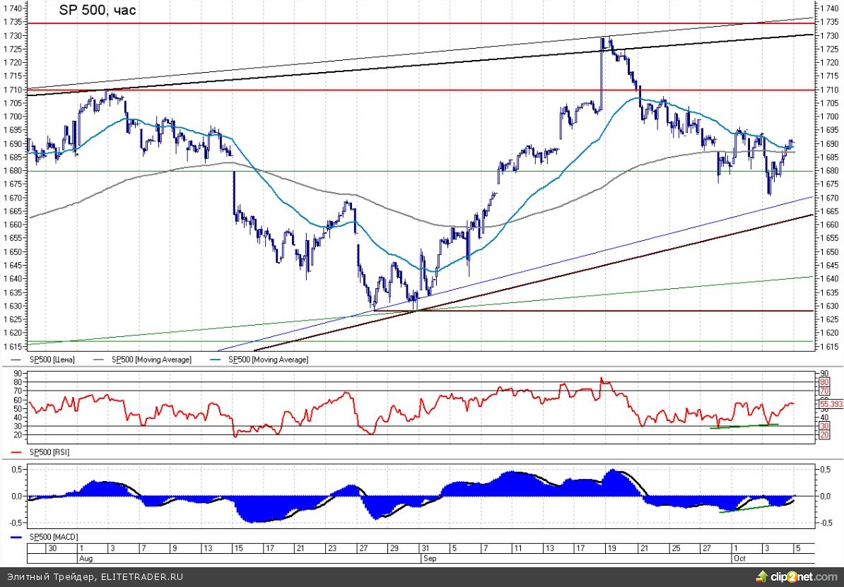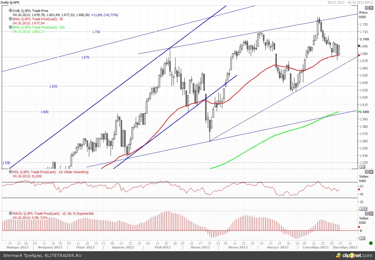 После того, как на часовых осцилляторах нарисовались сигналы к росту (бычьи дивергенции на MACD и RSI), индекс широкого рынка приступил к формированию очередного отскока. В пятницу на протяжении всей сессии мы наблюдали за постепенным ростом котировок, что отчасти было вызвано ожиданием инвесторов по скорому разрешению бюджетных и долговых проблем в США. К сожалению, помимо того, что конгрессмены проголосовали за выплату «задним числом» компенсаций госслужащим, которые были вынуждены уйти в отпуск из-за приостановки деятельности правительства, никакого конструктивного компромисса на этих выходных достигнуто не было, так что уже сегодня утром мы наблюдаем солидное снижение фьючерсов на S&P500.