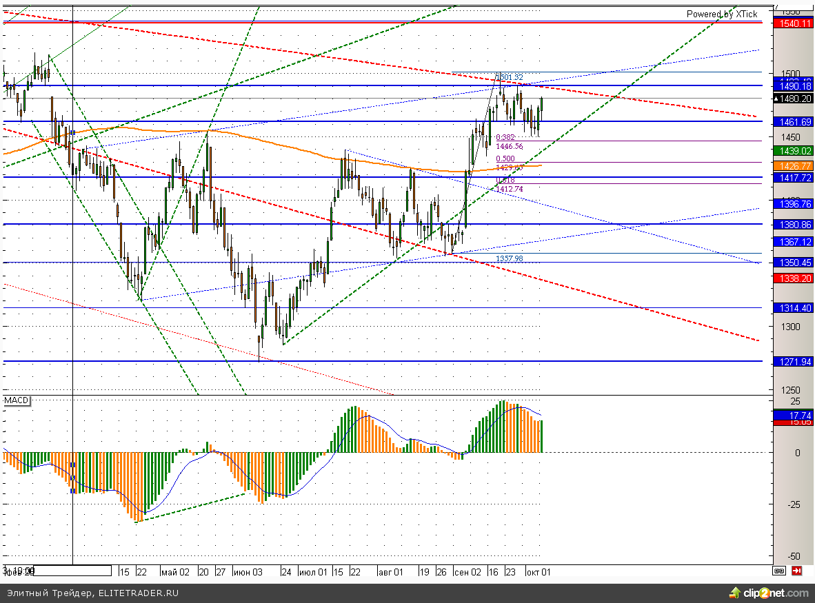 Индекс ММВБ вырос в ход торгов на 0,4% и уже подходит к своему серьезному сопротивлению на уровне 1490. На данной отметке проходит краткосрочная трендовая линия, пробой которой может существенно ускорить рост. Такое движение может случиться лишь, если американское правительство действительно разрешит текущие разногласия, чего впрочем пока не случилось.